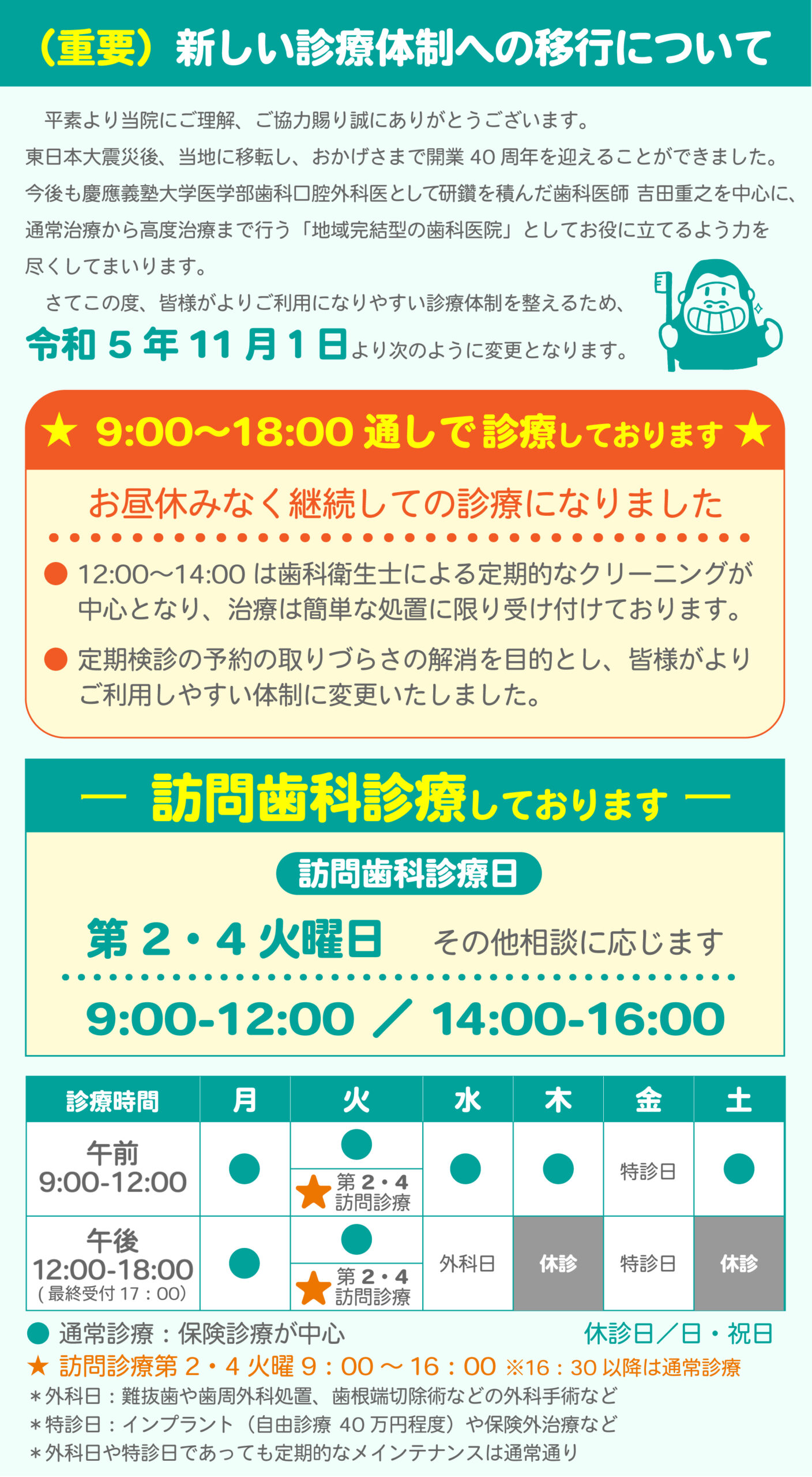 お通いいただいている患者様にはご迷惑をおかけいたしますが、今後深刻化する超高齢社会での訪問歯科診療や、高度治療を求める患者様の増加も鑑み、多くの皆様のご要望に安定して応えていくため、新体制へのご理解、ご協力のほど何卒宜しくお願い申し上げます。