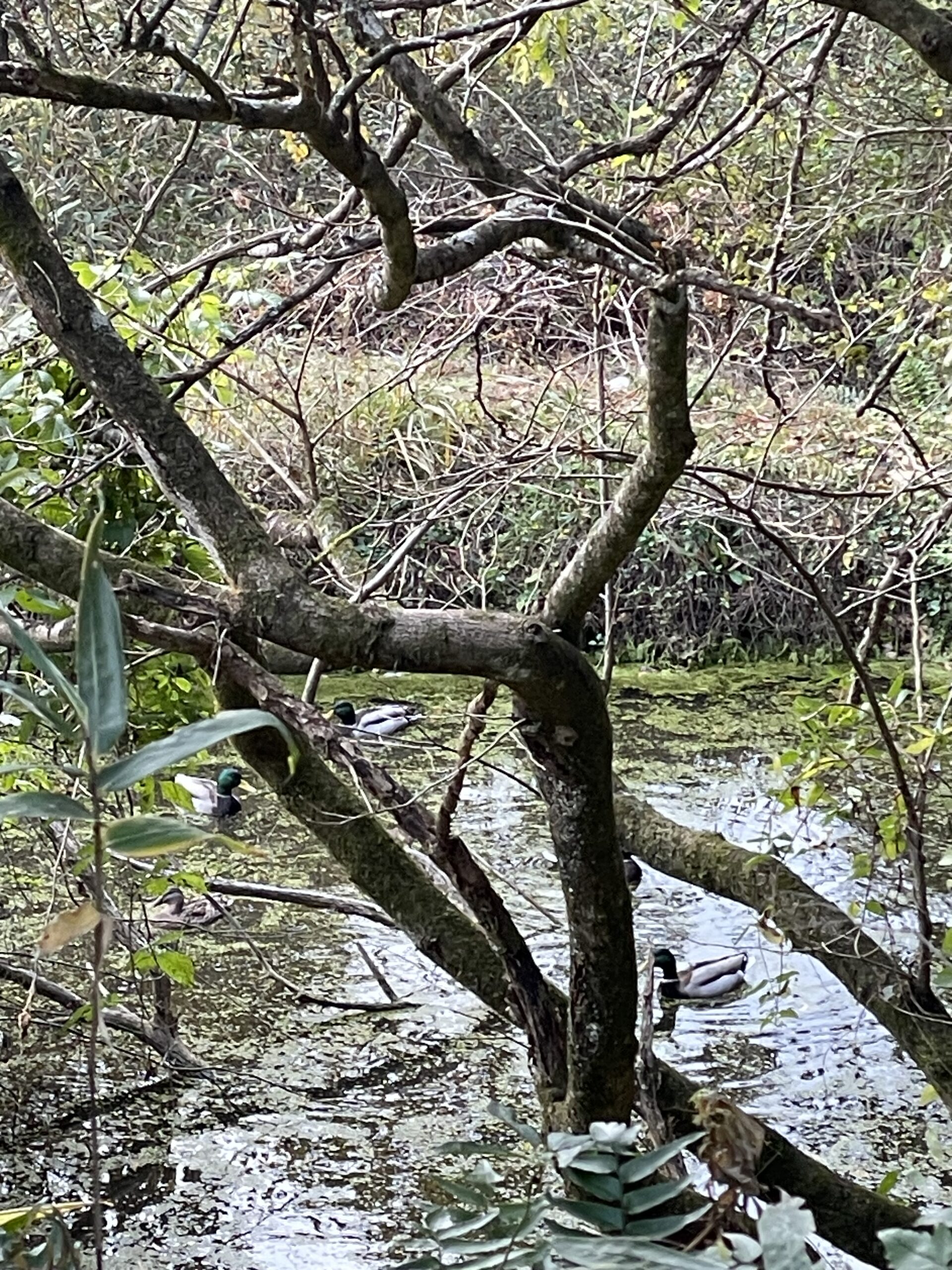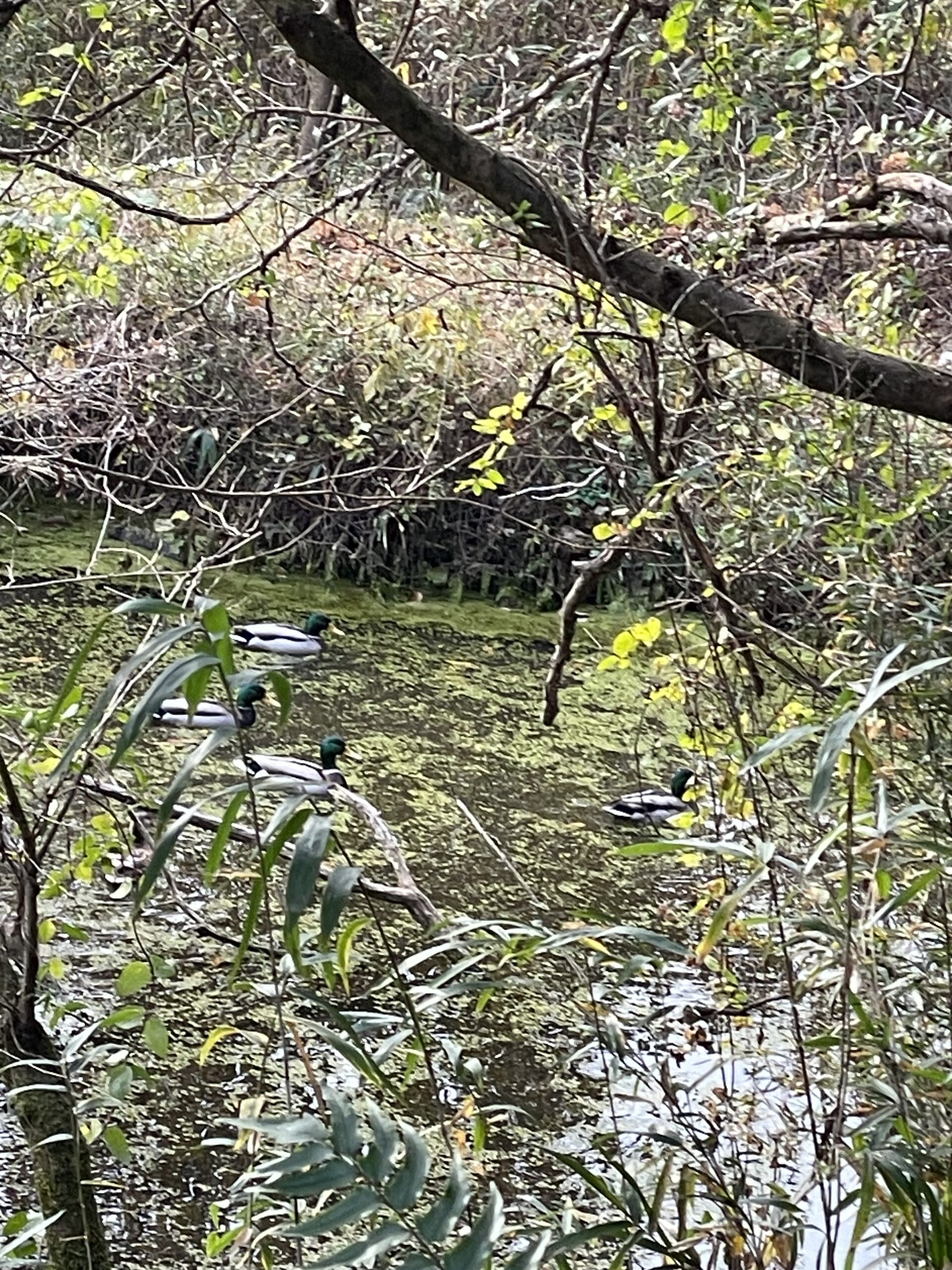 去年の秋のある日溜め池を見るとマガモの雄が4羽位見えたのですぐスマホを取りに行き、姿勢を低くし音をたてず気配を消してそーっと写真が撮れそうな位置に行きパシャリ📷